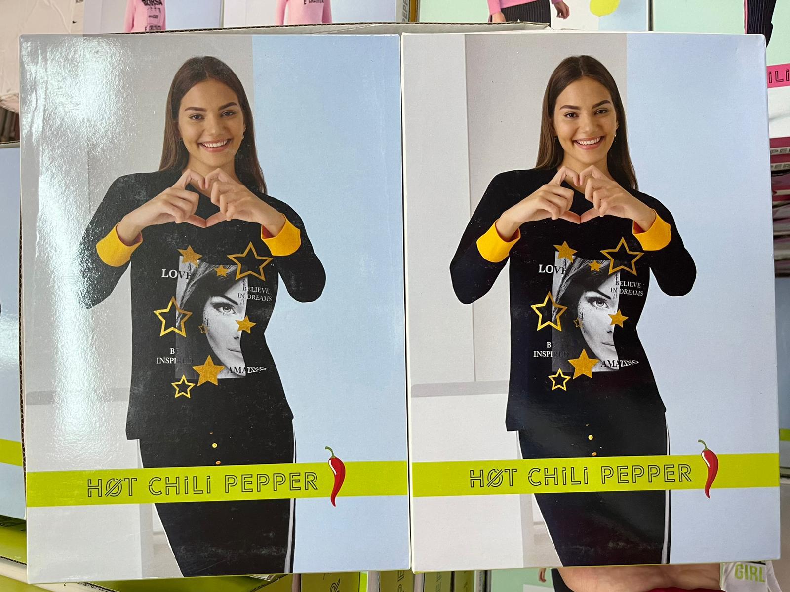 Simpaticissimo pigiama in cotone, con stampa glitterata sulla maglia e sulle braccia, pantaloni comodi con lacci ed elastico, tasche e linea lungo cosce a contrasto, elastici alle caviglie.