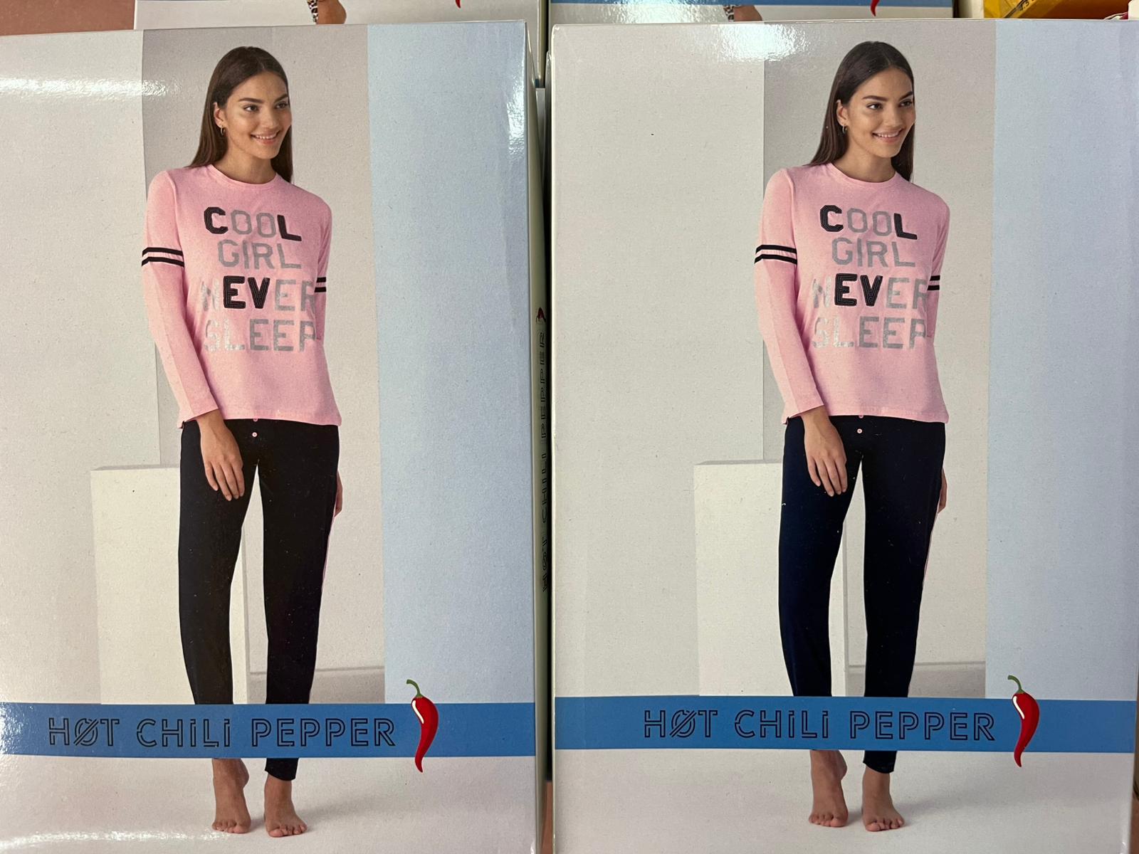 Simpaticissimo pigiama in cotone, con stampa glitterata sulla maglia e sulle braccia, pantaloni comodi con lacci ed elastico, tasche e linea lungo cosce a contrasto, elastici alle caviglie.